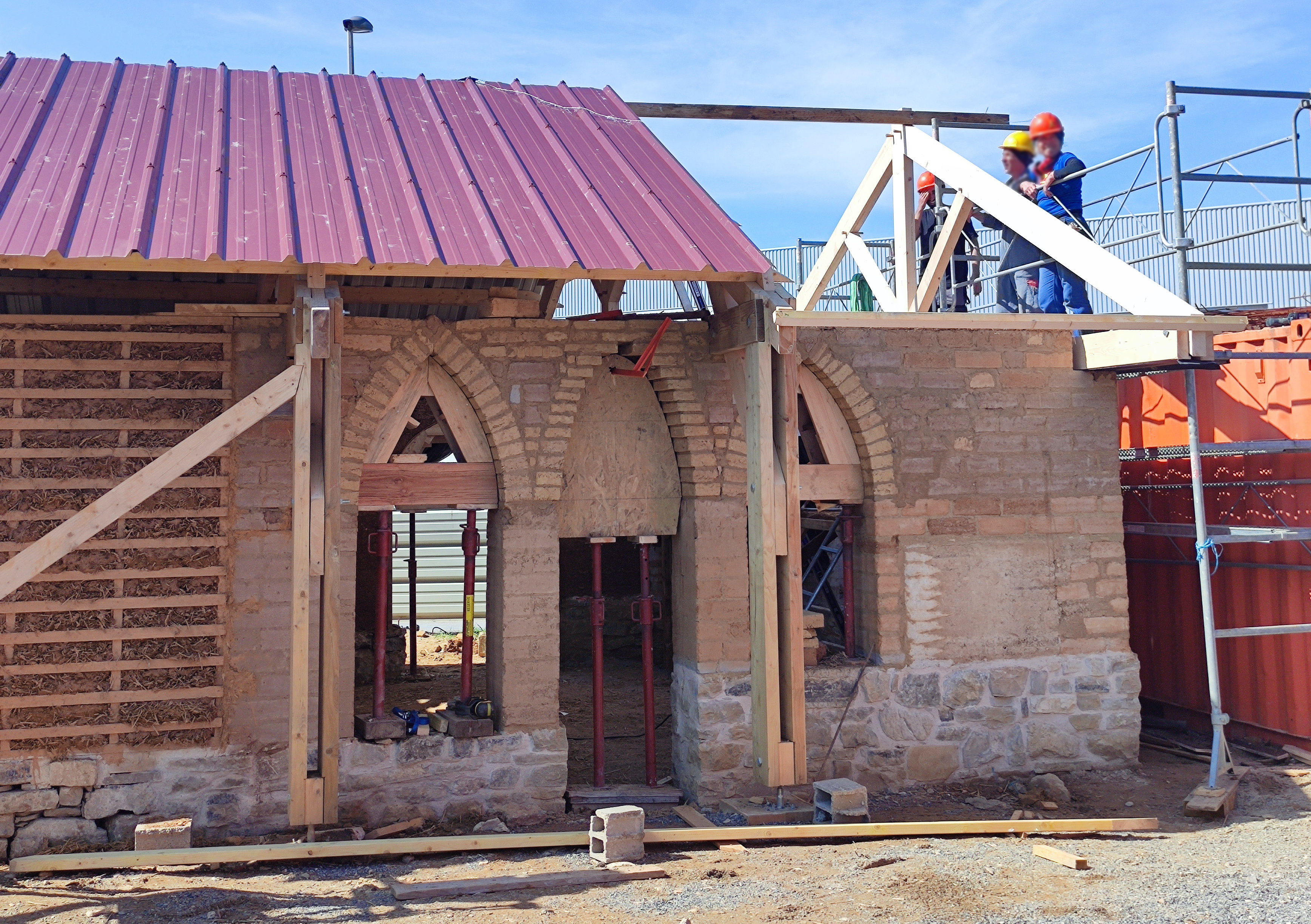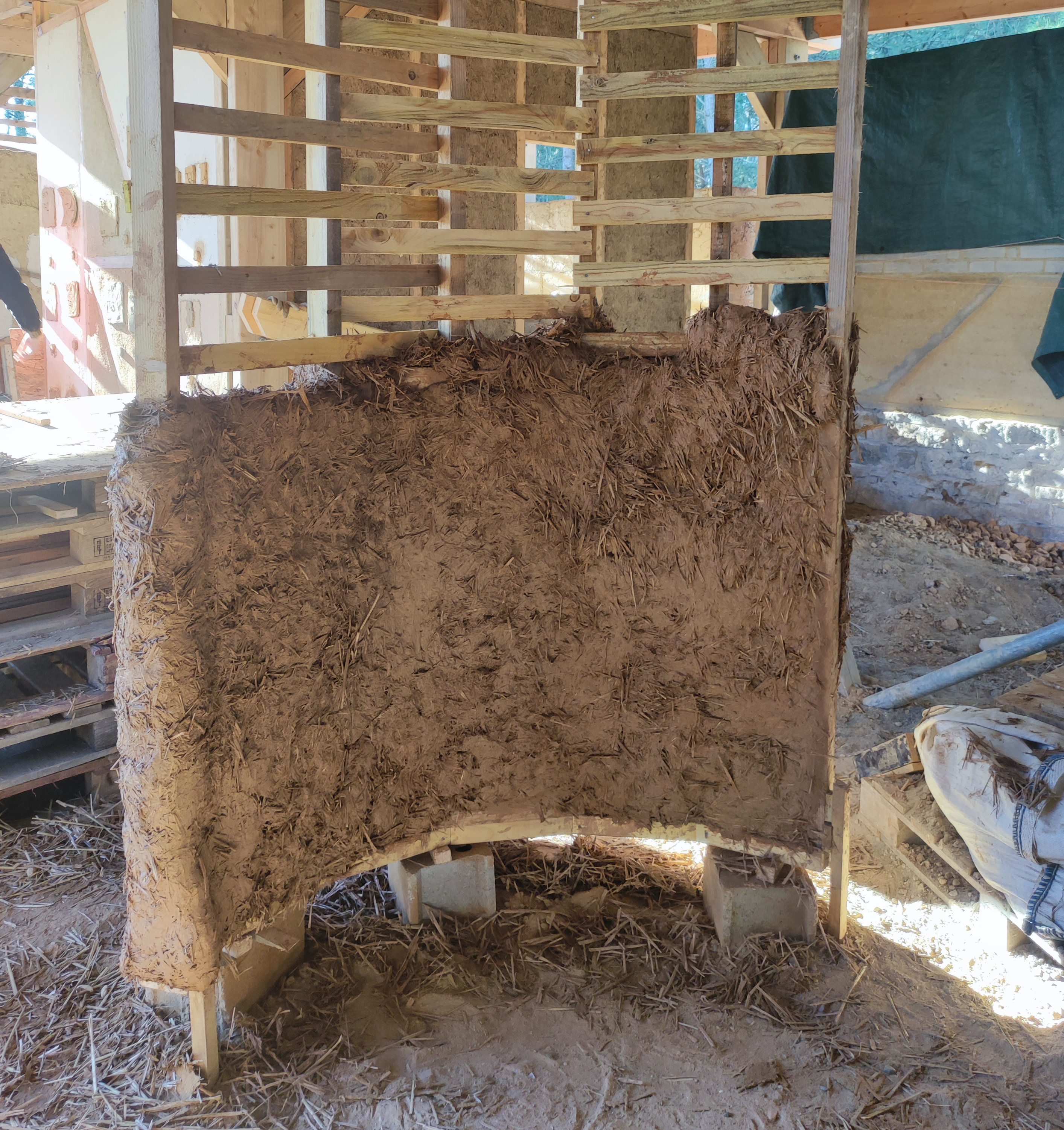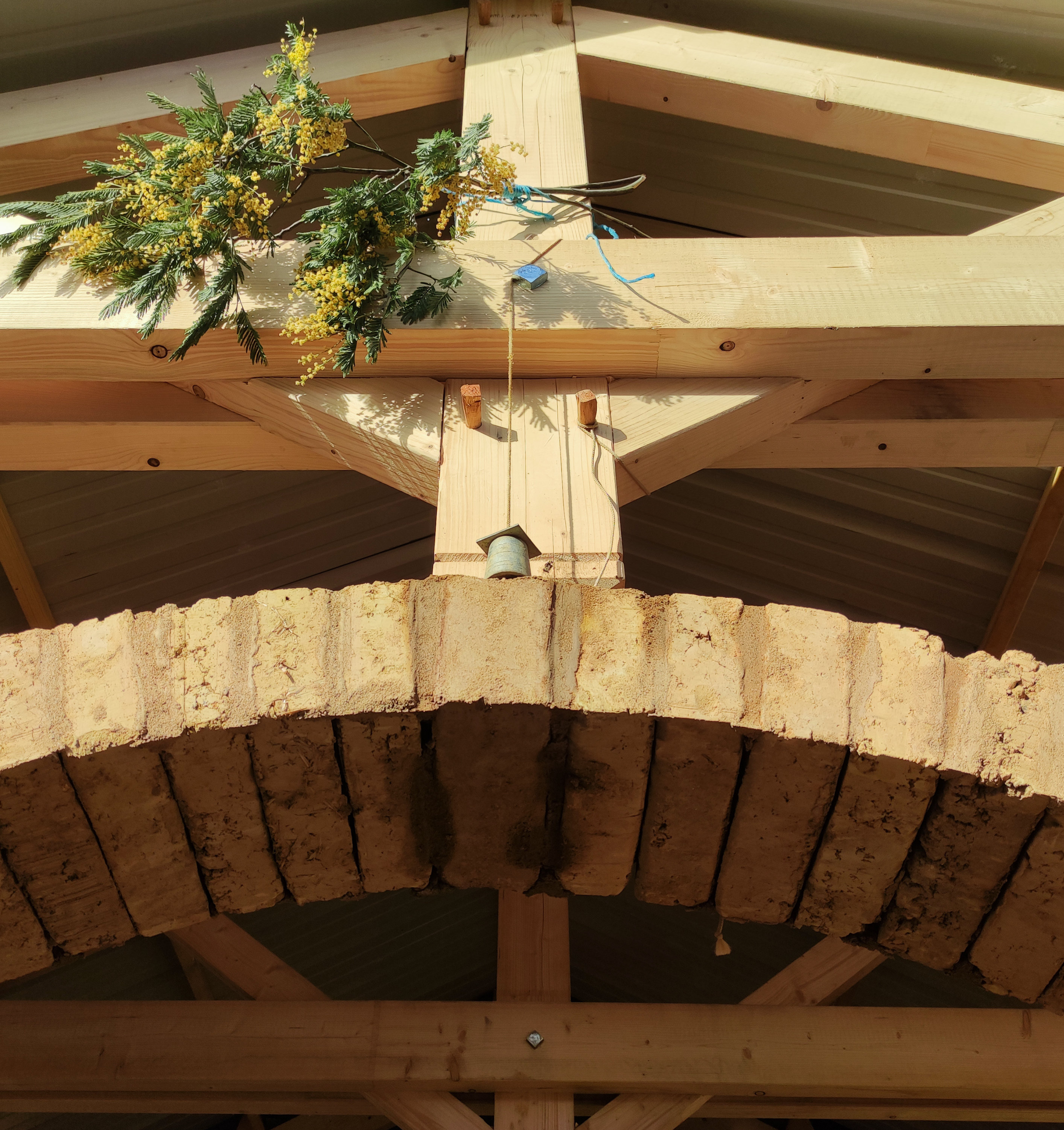 Mise en oeuvre de techniques de construction écologiques : charpente, isolation paille, maçonnerie en terre crue, soubassements en pierres. Utilisation de matériaux naturels disponibles localement ou en réemploi.